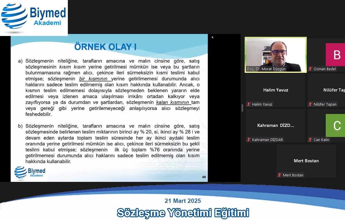 21 Mart 2025 tarihinde çevrimiçi canlı yayın formatında gerçekleştirdiğimiz Genel Katılıma Açık Sözleşme Yönetimi Eğitimifarklı sektörlerden önemli profesyonellerin katılımıyla başarıyla tamamlanmıştır. Biymed Akademi olarakkatılımcıların sözleşme süreçlerindeki hukuki yetkinliklerini güçlendirmeyi hedefledik.